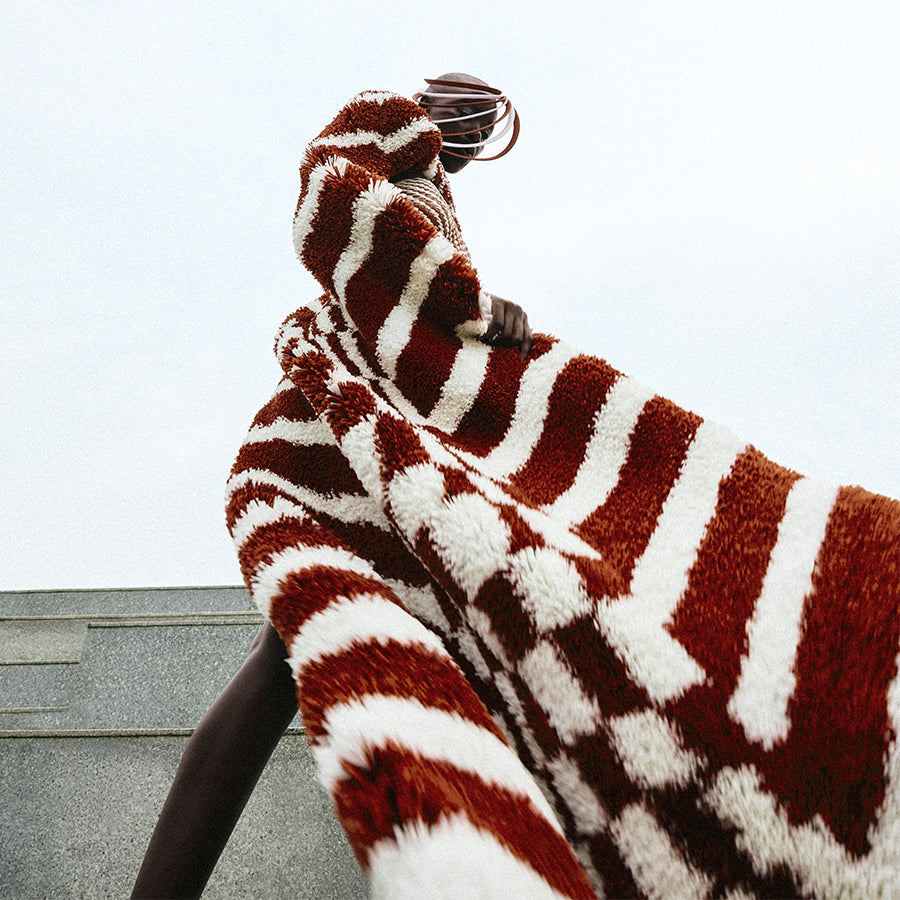 One of the most intricate expressions of this vision is a floor-length cape that took our atelier over 150 days to complete. Each strand of raffia was meticulously hand-cut into precise two-inch segments and individually stitched onto a two-meter base fabric, forming a bold geometric pattern in a curated palette of white and burnt orange. The result is a sculptural, textural masterpiece—an ode to slow fashion and uncompromising craftsmanship.