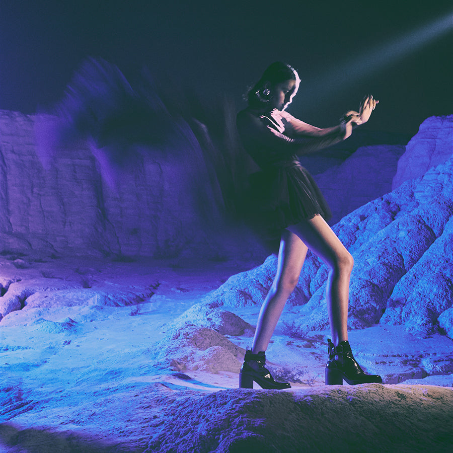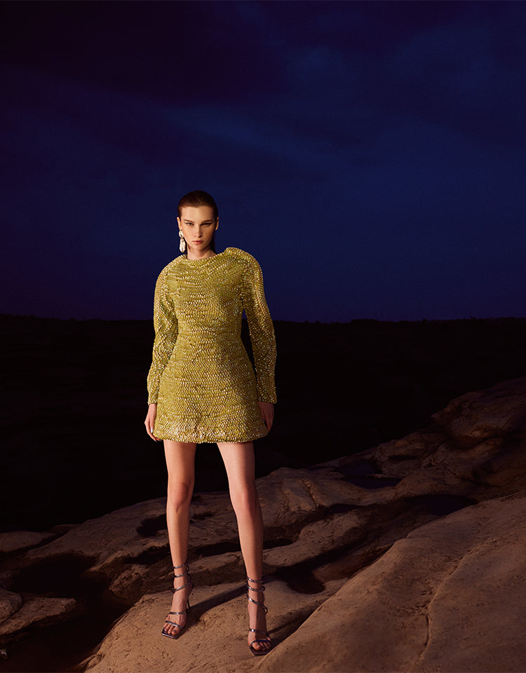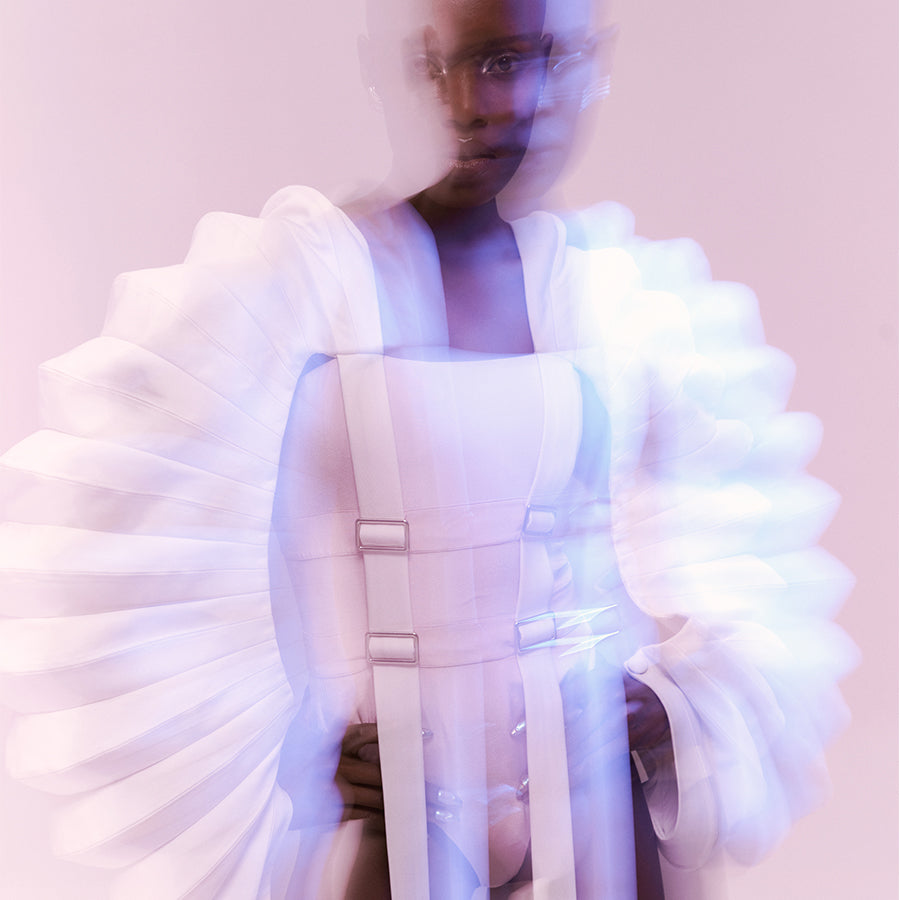 The dynamic movement and ever-changing patterns of a kaleidoscope, coupled with the distinctive sounds of its beads, have always been fascinating. Drawing inspiration from these elements, we developed the Euphonic collection. This line focuses on manipulating fabric to create 3D silhouettes, aiming to achieve a profound visual impact.