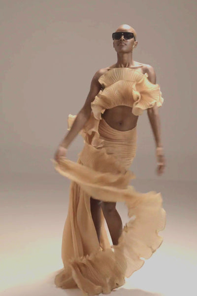 A true embodiment of sculptural elegance, this light gold bandeau gown is a poetic celebration of fluidity and form. Met… Read more