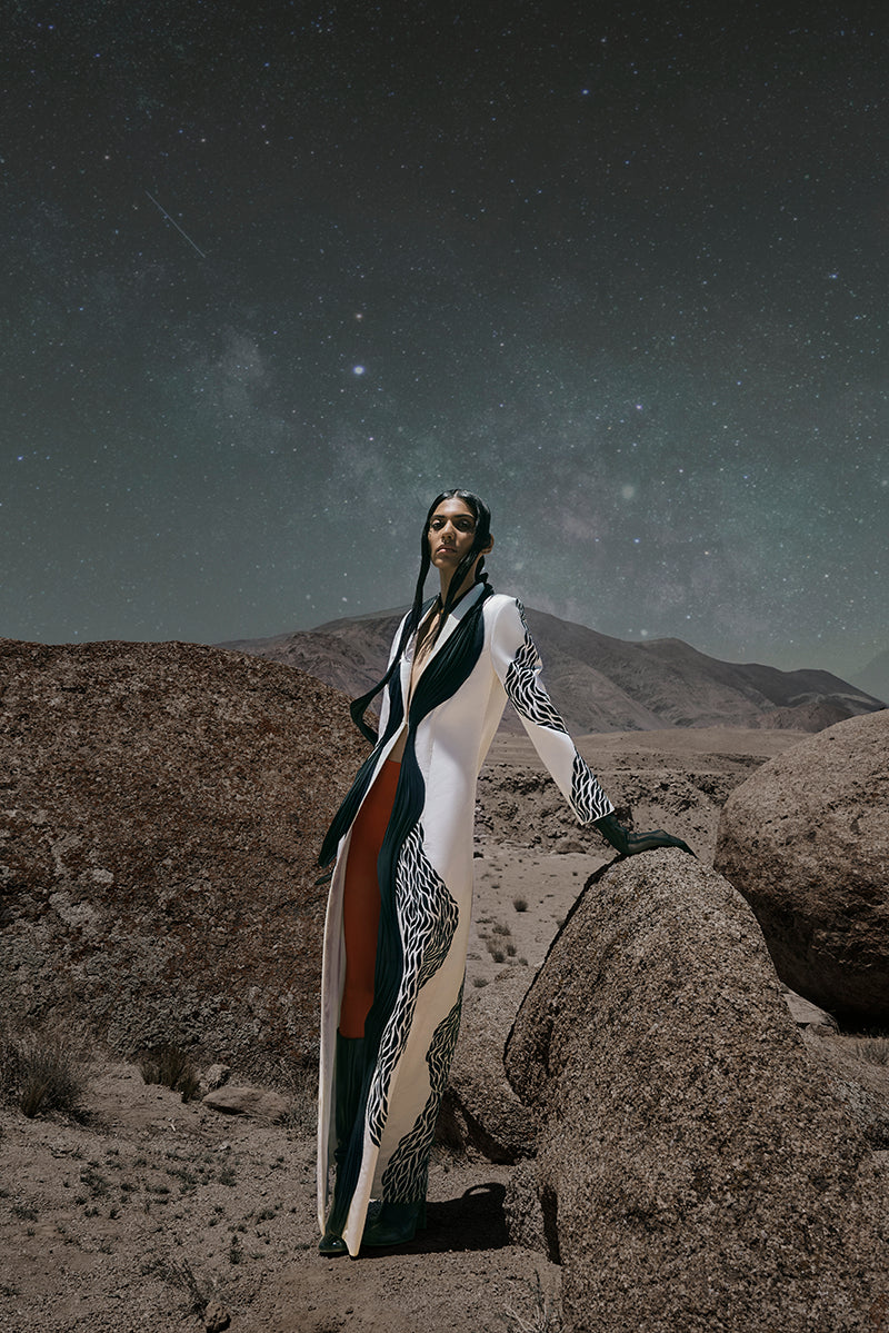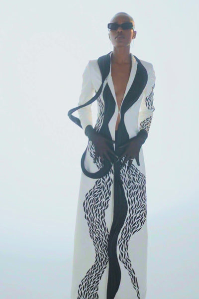 Crafted from sumptuous off-white taffeta, this floor-length jacket is a statement in refined elegance and artisanal excellence. Delicately hand-embroidered with black thread, every stitch speaks to the precision and artistry of our craft. What elevates this piece is the sculptural drape—meticulously constructed using a specially wired fabric, it cascades effortlessly from one side of the front panel, creating a striking interplay of structure and fluidity. A true embodiment of modern couture, this jacket redefines timeless sophistication through detail and form.