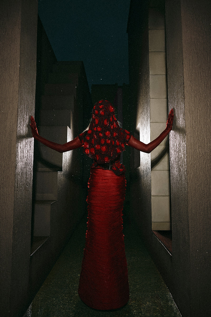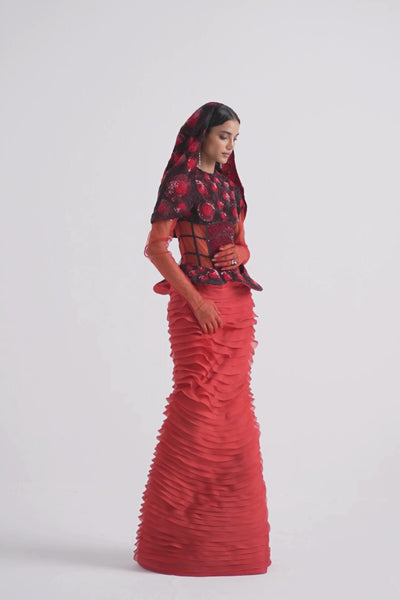 Crafted for those who possess the power to captivate, this couture gown masterfully fuses architectural precision with ethereal grace. The hand-embroidered bodice, meticulously adorned with thousands of shimmering sequins in rich, variegated hues of red, contours the figure with sculptural refinement, while artfully placed boning accentuates its striking silhouette. A semi-sheer bodysuit provides a delicate balance between subtle allure and regal sophistication, offering an intimate glimpse of sensuality. The skirt unfurls in cascading ruffles, creating a fluid, almost weightless movement with each step. A detachable, embroidered veil and sheer sleeves with delicately crafted gloves infuse an air of mystique and grandeur, evoking the allure of a bygone era. A concealed back zipper ensures a seamless, impeccable fit, allowing the gown’s radiant red hue to stand as a symbol of timeless luxury and enduring enchantment.