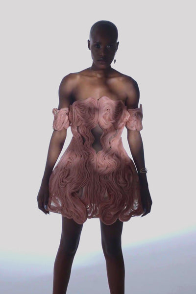 Exquisitely handcrafted, this off-shoulder mini dress is a celebration of sculptural elegance and couture craftsmanship. Designed with a structured, boned silhouette that cinches the torso and flares into a dramatic, dome-like shape, the piece commands attention with its refined form. Ethereal 3D pleated organza in a soft peach hue is artfully draped over a skin-toned net base, with each pleat meticulously positioned to create harmonious curves across the front and back. The sheer back panel subtly highlights the natural contours of the body, infusing the look with an alluring yet sophisticated charm. A true testament to modern luxury, this dress embodies both artistry and precision.