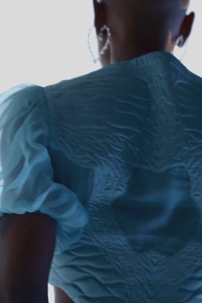 Elevate your wardrobe with this striking ensemble, masterfully handcrafted in soft, luminous blue satin. The top is defi… Read more