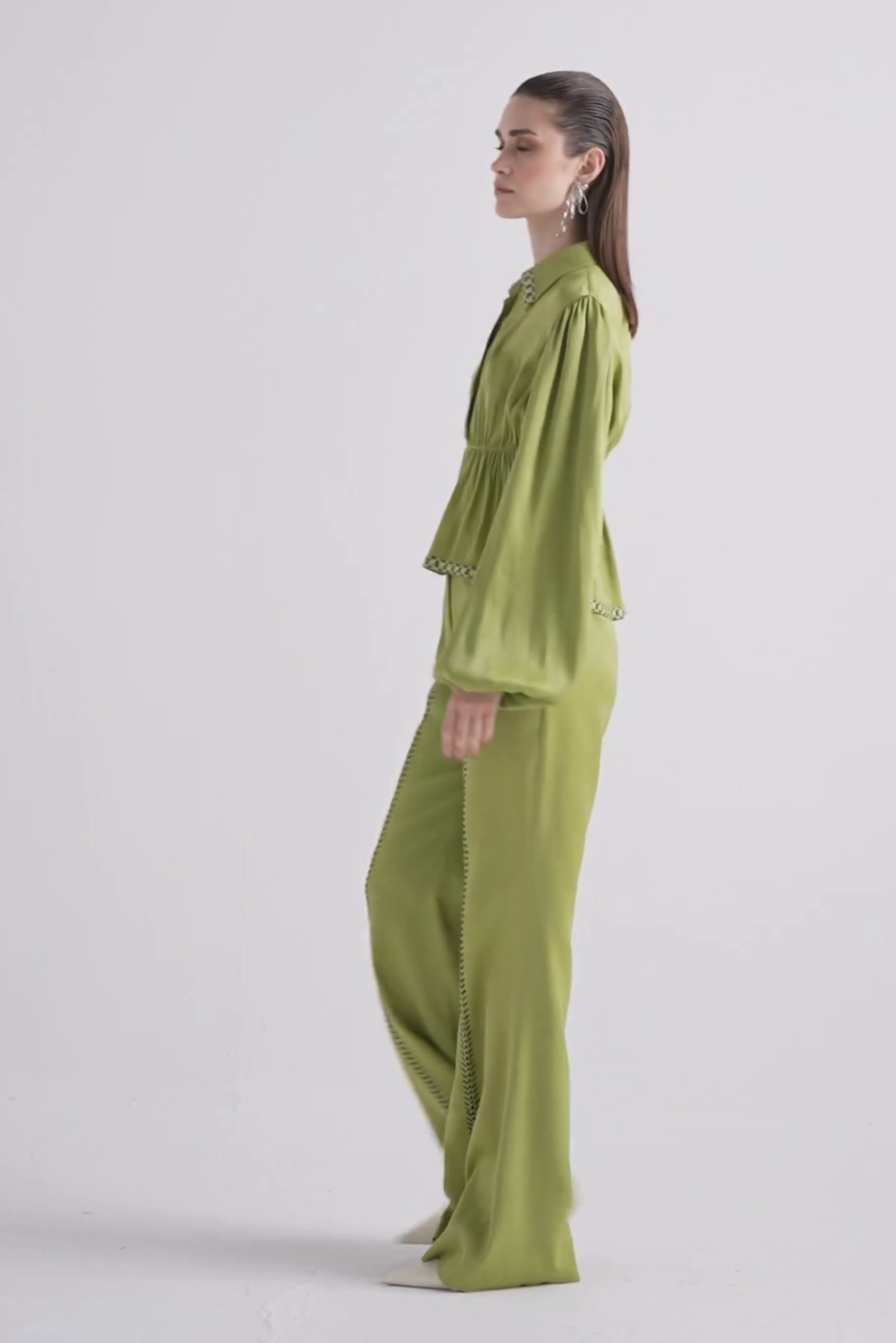 Raffia Embroidered Slit Pants in Green